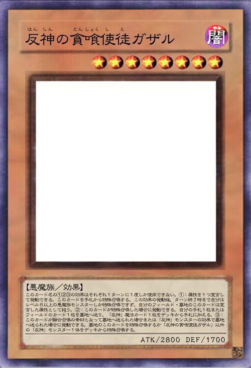 | このカード名の①②③の効果はそれぞれ1ターンに1度しか使用できない。①:属性を1つ宣言して発動できる。このカードを手札から特殊召喚する。この効果の発動後、ターン終了時まで自分はレベル8以上の悪魔族モンスターしか特殊召喚できず、自分のフィールド・墓地のこのカードは宣言した属性として扱う。②:このカードが特殊召喚した場合に発動できる。自分の手札1枚またはフィールドのカード1枚を墓地へ送り、「反神」魔法カード1枚をデッキから手札に加える。③:このカードが融合召喚の素材となって墓地へ送られた場合または「反神」モンスターの効果で墓地へ送られた場合に発動できる。墓地のこのカードを特殊召喚するか「反神の貪喰使徒ガザル」以外の「反神」モンスター1体をデッキから特殊召喚する。 | |||