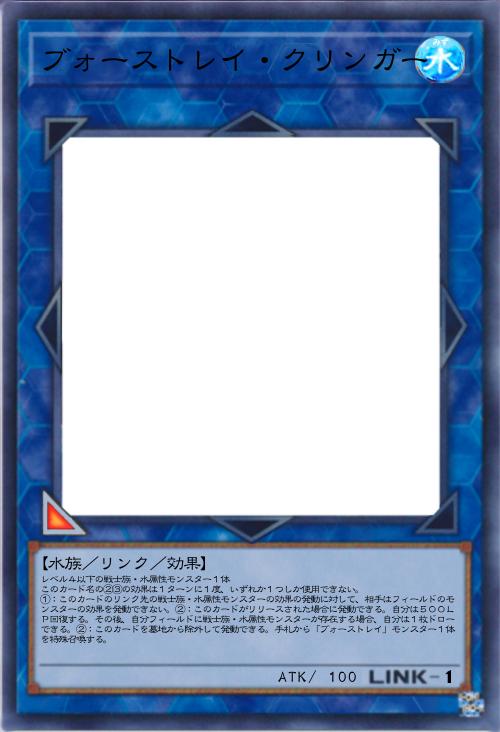| レベル4以下の戦士族・水属性モンスター1体 このカード名の②③の効果は1ターンに1度、いずれか1つしか使用できない。 ①:このカードのリンク先の戦士族・水属性モンスターの効果の発動に対して、相手はフィールドのモンスターの効果を発動できない。②:このカードがリリースされた場合に発動できる。自分は500LP回復する。その後、自分フィールドに戦士族・水属性モンスターが存在する場合、自分は1枚ドローできる。②:このカードを墓地から除外して発動できる。手札から「ブォーストレイ」モンスター1体を特殊召喚する。 | |||
