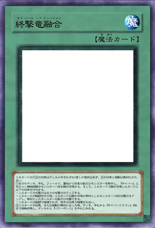 | このカードの①②の効果はデュエル中それぞれ1度しか使用出来ず、②の効果と発動は無効化されない。 ①自分のデッキ、手札、フィールド、墓地から任意の数だけモンスターを除外し、『サイバー』と名のつく機械族融合モンスター一体を融合召喚する。そして、このカードで融合召喚したカードに以下の効果を付与する。 ・このカードの攻撃力は元々の攻撃力分アップする。 ・このカードが戦闘を行う時、このカードの融合召喚の素材としたモンスター×500攻撃力をアップし、素材としたモンスターの数だけ攻撃できる。 ・このカードは戦闘で破壊されず、相手の効果で破壊されない。 ②このカードの効果、または発動が無効になった時、デッキ、手札から『サイバードラゴン』3体まで特殊召喚し、デッキから『パワーボンド』を手札に加える。 | |||