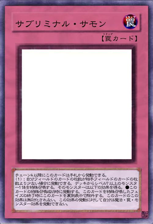 | チェーン4以降にこのカードは手札から発動できる。 (1):自分フィールドのカードの枚数が相手フィールドのカードの枚数より少ない場合に発動できる。デッキからレベル7以上のモンスター1体を特殊召喚する。そのモンスターは以下の効果を得る。●このカードの特殊召喚成功時に発動する。このカードを特殊召喚したフェイズの終了時にこのカードを裏側表示で除外する。このカードのこの効果は無効化されない。この効果の発動に対して自分は魔法・罠・モンスター効果を発動できない。 | |||