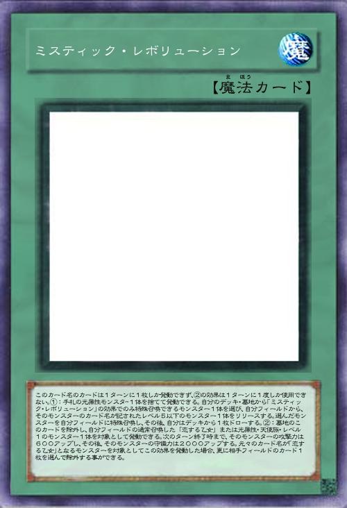 | このカード名のカードは1ターンに1枚しか発動できず、②の効果は1ターンに1度しか使用できない。①:手札の光属性モンスター1体を捨てて発動できる。自分のデッキ・墓地から「ミスティック・レボリューション」の効果でのみ特殊召喚できるモンスター1体を選び、自分フィールドから、そのモンスターのカード名が記されたレベル5以下のモンスター1体をリリースする。選んだモンスターを自分フィールドに特殊召喚し、その後、自分はデッキから1枚ドローする。②:墓地のこのカードを除外し、自分フィールドの通常召喚した「恋する乙女」または光属性・天使族・レベル1のモンスター1体を対象として発動できる。次のターン終了時まで、そのモンスターの攻撃力は600アップし、その後、そのモンスターの守備力は2000アップする。元々のカード名が「恋する乙女」となるモンスターを対象としてこの効果を発動した場合、更に相手フィールドのカード1枚を選んで除外する事ができる。 | |||