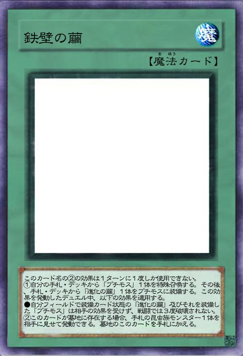 | このカード名の②の効果は1ターンに1度しか使用できない。 ①自分の手札・デッキから「プチモス」1体を特殊召喚する。その後、手札・デッキから「進化の繭」1体をプチモスに装備する。この効果を発動したデュエル中、以下の効果を適用する。 ●自分フィールドで装備カード状態の「進化の繭」及びそれを装備した「プチモス」は相手の効果を受けず、戦闘では3度破壊されない。 ②このカードが墓地に存在する場合、手札の昆虫族モンスター1体を相手に見せて発動できる。墓地のこのカードを手札に加える。 | |||