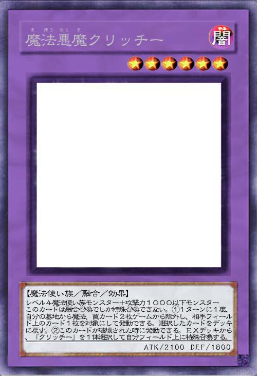 | レベル4魔法使い族モンスター+攻撃力1000以下モンスター このカードは融合召喚でしか特殊召喚できない。①1ターンに1度、自分の墓地から魔法、罠カード2枚ゲームから除外し、相手フィールド上のカード1枚を対象にして発動できる。選択したカードをデッキに戻す。②このカードが破壊された時に発動できる。EXデッキから、「クリッチー」を1体選択して自分フィールド上に特殊召喚する。 | |||