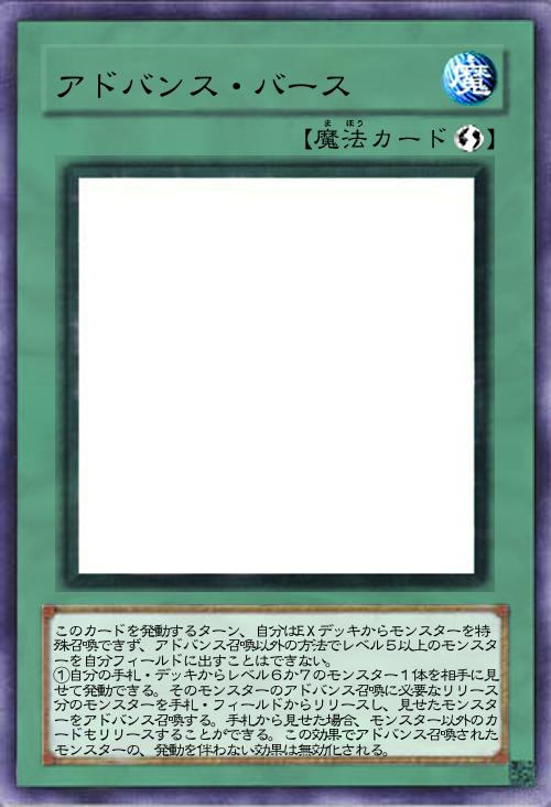 | このカードを発動するターン、自分はEXデッキからモンスターを特殊召喚できず、アドバンス召喚以外の方法でレベル5以上のモンスターを自分フィールドに出すことはできない。 ①自分の手札・デッキからレベル6か7のモンスター1体を相手に見せて発動できる。そのモンスターのアドバンス召喚に必要なリリース分のモンスターを手札・フィールドからリリースし、見せたモンスターをアドバンス召喚する。手札から見せた場合、モンスター以外のカードもリリースすることができる。この効果でアドバンス召喚されたモンスターの、発動を伴わない効果は無効化される。 | |||
