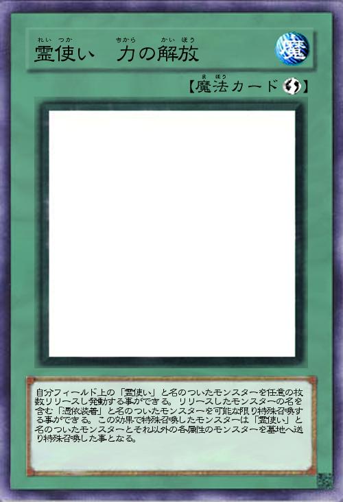 | 自分フィールド上の「霊使い」と名のついたモンスターを任意の枚数リリースし発動する事ができる。リリースしたモンスターの名を含む「憑依装着」と名のついたモンスターを可能な限り特殊召喚する事ができる。この効果で特殊召喚したモンスターは「霊使い」と名のついたモンスターとそれ以外の各属性のモンスターを墓地へ送り特殊召喚した事となる。 | |||