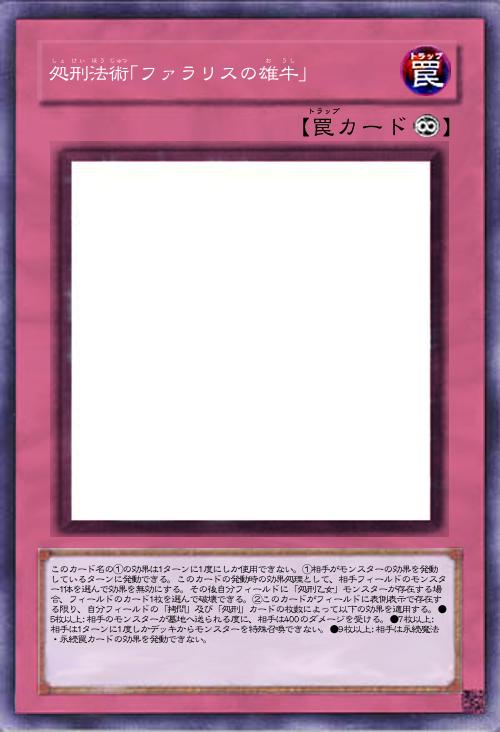 | このカード名の①の効果は1ターンに1度にしか使用できない。①相手がモンスターの効果を発動しているターンに発動できる。このカードの発動時の効果処理として、相手フィールドのモンスター1体を選んで効果を無効にする。その後自分フィールドに「処刑乙女」モンスターが存在する場合、フィールドのカード1枚を選んで破壊できる。②このカードがフィールドに表側表示で存在する限り、自分フィールドの「拷問」及び「処刑」カードの枚数によって以下の効果を適用する。●5枚以上:相手のモンスターが墓地へ送られる度に、相手は400のダメージを受ける。●7枚以上:相手は1ターンに1度しかデッキからモンスターを特殊召喚できない。●9枚以上:相手は永続魔法・永続罠カードの効果を発動できない。 | |||