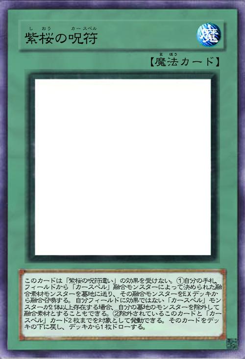 | このカードは「紫桜の呪符遣い」の効果を受けない。①自分の手札、フィールドから「カースペル」融合モンスターによって決められた融合素材モンスターを墓地に送り、その融合モンスターをEXデッキから融合召喚する。自分フィールドに効果ではない「カースペル」モンスターが2体以上存在する場合、自分の墓地のモンスターを除外して融合素材とすることもできる。②除外されているこのカードと「カースペル」カード2枚までを対象として発動できる。そのカードをデッキの下に戻し、デッキから1枚ドローする。 | |||
