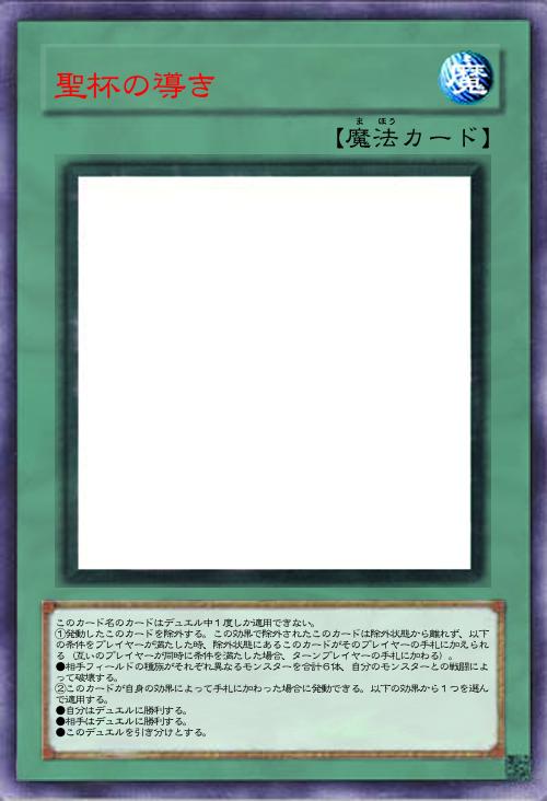 | このカード名のカードはデュエル中1度しか適用できない。 ①発動したこのカードを除外する。この効果で除外されたこのカードは除外状態から離れず、以下の条件をプレイヤーが満たした時、除外状態にあるこのカードがそのプレイヤーの手札に加えられる(互いのプレイヤーが同時に条件を満たした場合、ターンプレイヤーの手札に加わる)。 ●相手フィールドの種族がそれぞれ異なるモンスターを合計6体、自分のモンスターとの戦闘によって破壊する。 ②このカードが自身の効果によって手札に加わった場合に発動できる。以下の効果から1つを選んで適用する。 ●自分はデュエルに勝利する。 ●相手はデュエルに勝利する。 ●このデュエルを引き分けとする。 | |||