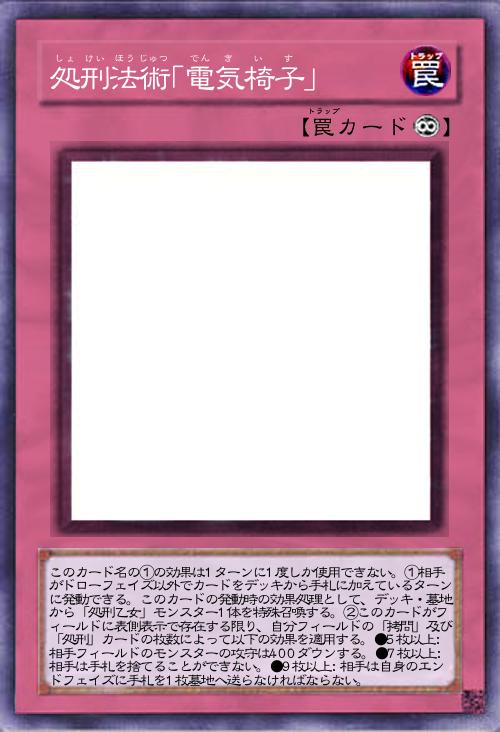 | このカード名の①の効果は1ターンに1度しか使用できない。①相手がドローフェイズ以外でカードをデッキから手札に加えているターンに発動できる。このカードの発動時の効果処理として、デッキ・墓地から「処刑乙女」モンスター1体を特殊召喚する。②このカードがフィールドに表側表示で存在する限り、自分フィールドの「拷問」及び「処刑」カードの枚数によって以下の効果を適用する。●5枚以上:相手フィールドのモンスターの攻守は400ダウンする。●7枚以上:相手は手札を捨てることができない。●9枚以上:相手は自身のエンドフェイズに手札を1枚墓地へ送らなければならない。 | |||