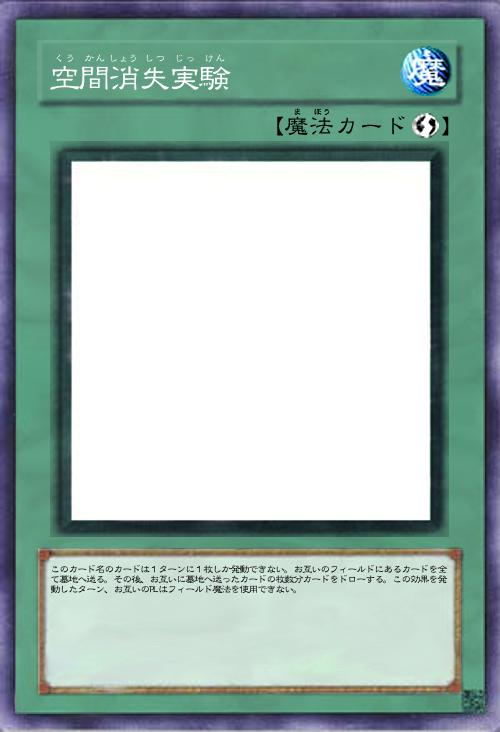 | このカード名のカードは1ターンに1枚しか発動できない。お互いのフィールドにあるカードを全て墓地へ送る。その後、お互いに墓地へ送ったカードの枚数分カードをドローする。この効果を発動したターン、お互いのPLはフィールド魔法を使用できない。 | |||