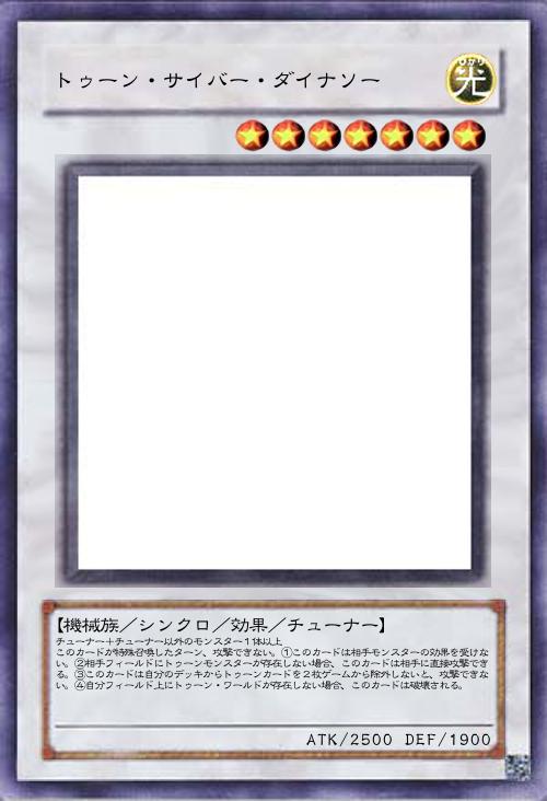 | チューナー+チューナー以外のモンスター1体以上 このカードが特殊召喚したターン、攻撃できない。①このカードは相手モンスターの効果を受けない。②相手フィールドにトゥーンモンスターが存在しない場合、このカードは相手に直接攻撃できる。③このカードは自分のデッキからトゥーンカードを2枚ゲームから除外しないと、攻撃できない。④自分フィールド上にトゥーン・ワールドが存在しない場合、このカードは破壊される。 | |||