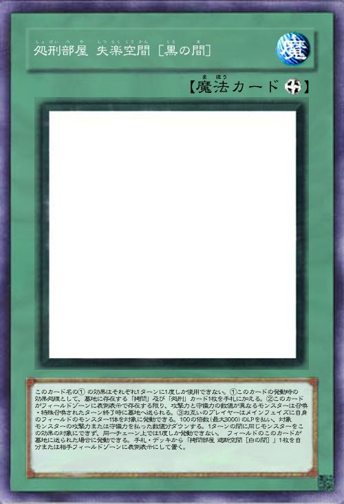 | このカード名の①➃の効果はそれぞれ1ターンに1度しか使用できない。①このカードの発動時の効果処理として、墓地に存在する「拷問」及び「処刑」カード1枚を手札に加える。②このカードがフィールドゾーンに表側表示で存在する限り、攻撃力と守備力の数値が異なるモンスターは召喚・特殊召喚されたターン終了時に墓地へ送られる。③お互いのプレイヤーはメインフェイズに自身のフィールドのモンスター1体を対象に発動できる。100の倍数(最大3000)のLPを払い、対象モンスターの攻撃力または守備力を払った数値分ダウンする。1ターンの間に同じモンスターをこの効果の対象にできず、同一チェーン上では1度しか発動できない。➃フィールドのこのカードが墓地に送られた場合に発動できる。手札・デッキから「拷問部屋 遮断空間[白の間]」1枚を自分または相手フィールドゾーンに表側表示にして置く。 | |||