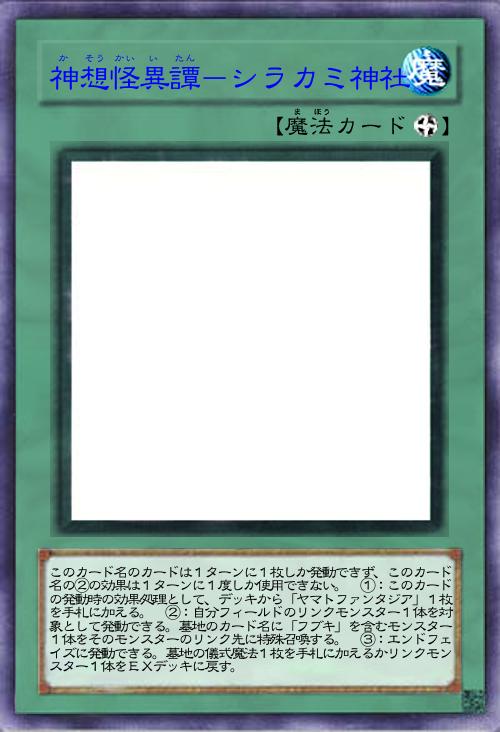 | このカード名のカードは1ターンに1枚しか発動できず、このカード名の②の効果は1ターンに1度しか使用できない。 ①:このカードの発動時の効果処理として、デッキから「ヤマトファンタジア」1枚を手札に加える。 ②:自分フィールドのリンクモンスター1体を対象として発動できる。墓地のカード名に「フブキ」を含むモンスター1体をそのモンスターのリンク先に特殊召喚する。 ③:エンドフェイズに発動できる。墓地の儀式魔法1枚を手札に加えるかリンクモンスター1体をEXデッキに戻す。 | |||