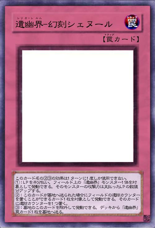 | このカード名の②③の効果は1ターンに1度しか使用できない。 ①:LPを半分払い、フィールド上の「遺幽界」モンスター1体を対象として発動できる。そのモンスターの攻撃力は支払ったLPの数値分アップする。 ②:このカードが墓地へ送られた場合にフィールドの遺跡カウンターを置くことができるカード1枚を対象として発動できる。そのカードに遺跡カウンターを1つ置く。 ③:墓地のこのカードを除外して発動できる。デッキから「遺幽界」罠カード1枚を墓地へ送る。 | |||