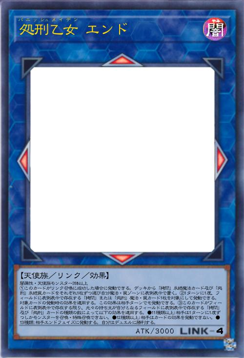 | 闇属性・天使族モンスター3体以上 ①このカードがリンク召喚に成功した場合に発動できる。デッキから「拷問」永続魔法カード及び「処刑」永続罠カードをそれぞれ1枚ずつ選び自分魔法・罠ゾーンに表側表示で置く。②1ターンに1度、フィールドに表側表示で存在する「拷問」または「処刑」魔法・罠カード1枚を対象にして発動できる。対象カードの発動時の効果を適用する。この効果は相手ターンでも発動できる。③このカードがフィールドに表側表示で存在する限り、元々の持ち主が自分となるフィールドに表側表示で存在する「拷問」及び「処刑」カードの種類の数によって以下の効果を適用する。●11種類以上:相手は1ターンに1度ずつしかモンスターを召喚・特殊召喚できない。●12種類以上:相手はカードの効果を発動できない。●13種類:相手エンドフェイズに発動する。自分はデュエルに勝利する。 | |||