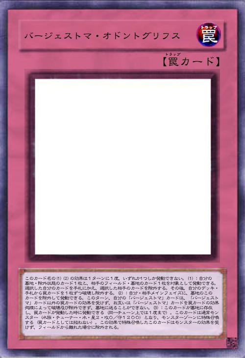 | このカード名の(1)(2)の効果は1ターンに1度、いずれか1つしか発動できない。(1):自分の墓地・除外状態のカード1枚と、相手のフィールド・墓地のカード1枚を対象として発動できる。選択した自分のカードを手札に加え、選択した相手のカードを除外する。その後、自分のデッキ・手札から罠カードを1枚ずつ破壊し除外する。(2):自分・相手メインフェイズに、墓地のこのカードを除外して発動できる。このターン、自分の「バージェストマ」カードは、「バージェストマ」カード以外の罠カードの効果を受けず、お互いは「バージェストマ」カードを罠カードの効果処理によって破壊及び除外できず、墓地に送ることができない。(3):このカードが墓地に存在し、罠カードが発動した時に発動できる(同一チェーン上では1度まで)。このカードは通常モンスター(水族・チューナー・水・星2・攻0/守1200)となり、モンスターゾーンに特殊召喚する(罠カードとしては扱わない)。この効果で特殊召喚したこのカードはモンスターの効果を受けず、フィールドから離れた場合に除外される。 | |||