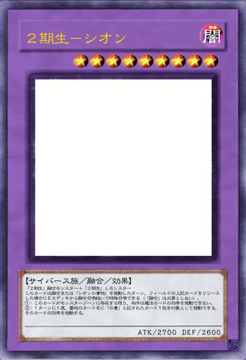 | 「2期生」融合モンスター+「2期生」Lモンスター このカードは融合または「シオンの書物」を発動したターン、フィールドの上記カードをリリースした場合にEXデッキから融合召喚扱いで特殊召喚できる(「融合」は必要としない)。 ①:このカードがモンスターゾーンに存在する限り、相手は魔法カードの効果を発動できない。 ②:1ターンに1度、墓地のカード名に「の書」と記されたカード1枚を対象として発動できる。そのカードの効果を発動する。 | |||
