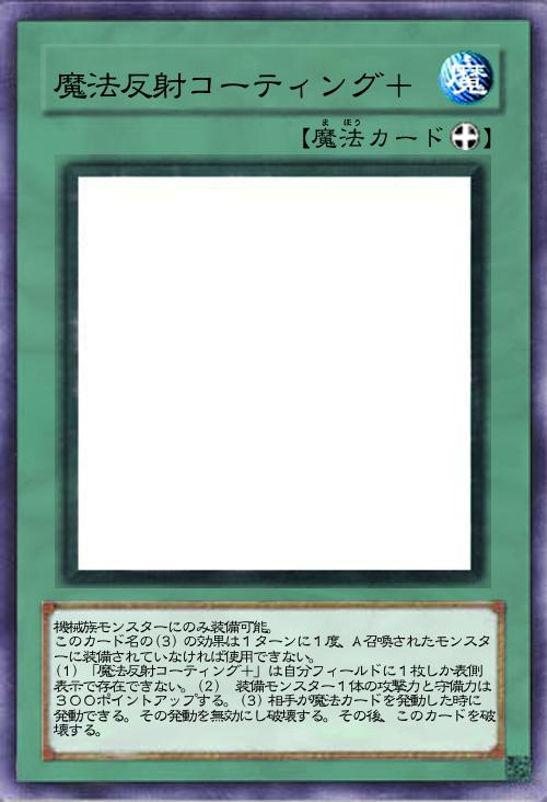 | 機械族モンスターにのみ装備可能。 このカード名の(3)の効果は1ターンに1度、A召喚されたモンスターに装備されていなければ使用できない。 (1)「魔法反射コーティング+」は自分フィールドに1枚しか表側表示で存在できない。(2) 装備モンスター1体の攻撃力と守備力は300ポイントアップする。(3)相手が魔法カードを発動した時に発動できる。その発動を無効にし破壊する。その後、このカードを破壊する。 | |||