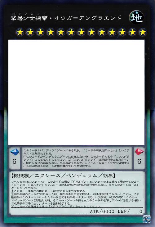 | レベル6のPモンスター×3 このカードは場の「ドガルギア」モンスターの上に重ねる場合全てのカードゾーンの「ドガルギア」モンスターは効果が無効化され特殊召喚出来ない。またこのカードは「VX」カードとしても扱う。 ①このカードは相手の場のカードが0枚になるまで攻撃する。 ②相手の場のカードが0枚になった時、相手の手札を全て除外し、相手は3枚までドローしてよい、その後相手はこのターンドローしたカード全てを効果モンスター「死という消滅」(攻1000守0:このカードがカードゾーンを移動した時、そのカードゾーンの持ち主このカードの攻撃力ダメージを受ける)扱いで攻撃表示で場に出し、ターンを強制終了する。 ③このカードを除外する事で「エクスグラウンド」をセットしてもよい。 | |||