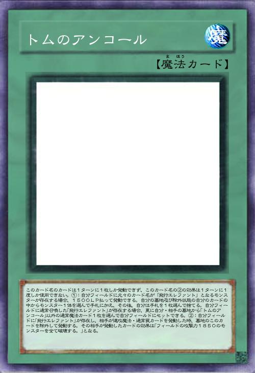 | このカード名のカードは1ターンに1枚しか発動できず、このカード名の②の効果は1ターンに1度しか使用できない。①:自分フィールドに元々のカード名が「飛行エレファント」となるモンスターが存在する場合、1500LP払って発動できる。自分の墓地及び除外状態の自分のカードの中からモンスター1体を選んで手札に加え、その後、自分は手札を1枚選んで捨てる。自分フィールドに通常召喚した「飛行エレファント」が存在する場合、更に自分・相手の墓地から「トムのアンコール」以外の通常魔法カード1枚を選んで自分フィールドにセットできる。②:自分フィールドに「飛行エレファント」が存在し、相手が速攻魔法・通常罠カードを発動した時、墓地のこのカードを除外して発動する。その相手が発動したカードの効果は「フィールドの攻撃力1850のモンスターを全て破壊する。」となる。 | |||