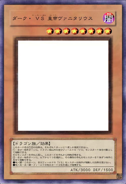 | このカード名の①②の効果は、それぞれ1ターンに1度しか使用できない。 ①:自分・相手ターンに、ドラゴン族以外の自分フィールドの「VS」モンスター1体を対象として発動できる。 そのモンスターを手札に戻し、このカードを手札から特殊召喚する。 ②:自分・相手ターンに、以下から1つを選択し、その属性の手札のモンスターを1体ずつ相手に見せて発動できる。 ●地・闇:このターン、自分フィールドの「ⅤS」モンスターは相手が発動した効果を受けない。 ●地・炎・炎・闇:フィールドの他のカード2枚を選んで破壊する。 | |||