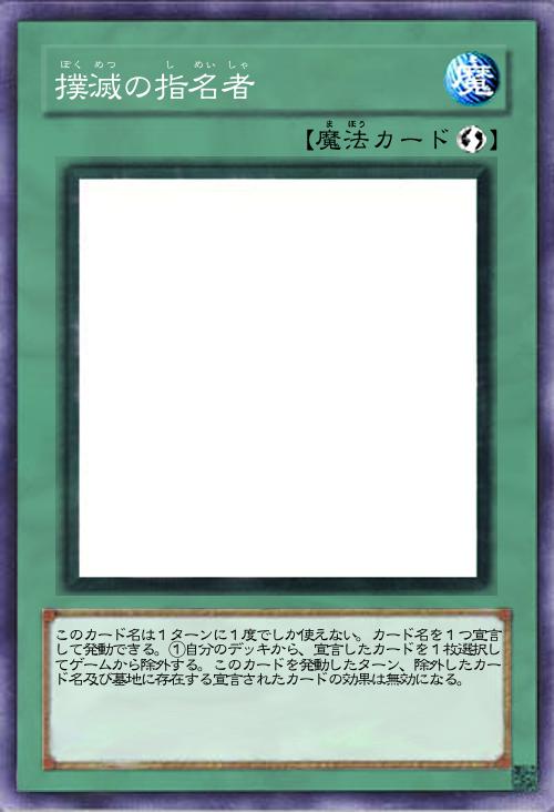 | このカード名は1ターンに1度でしか使えない。カード名を1つ宣言して発動できる。①自分のデッキから、宣言したカードを1枚選択してゲームから除外する。このカードを発動したターン、除外したカード名及び墓地に存在する宣言されたカードの効果は無効になる。 | |||