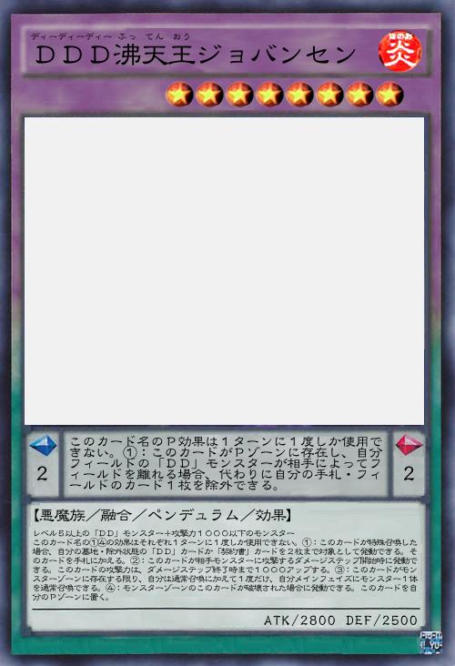 | レベル5以上の「DD」モンスター+攻撃力1000以下のモンスター このカード名の①④の効果はそれぞれ1ターンに1度しか使用できない。①:このカードが特殊召喚した場合、自分の墓地・除外状態の「DD」カードか「契約書」カードを2枚まで対象として発動できる。そのカードを手札に加える。②:このカードが相手モンスターに攻撃するダメージステップ開始時に発動できる。このカードの攻撃力は、ダメージステップ終了時まで1000アップする。③:このカードがモンスターゾーンに存在する限り、自分は通常召喚に加えて1度だけ、自分メインフェイズにモンスター1体を通常召喚できる。④:モンスターゾーンのこのカードが破壊された場合に発動できる。このカードを自分のPゾーンに置く。 | |||
