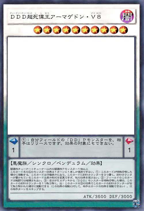 | 闇属性チューナー+チューナー以外の闇属性Pモンスター1体以上 このカード名の④のモンスター効果は1ターンに1度しか使用できない。①:このカードが特殊召喚した場合に発動する。このカードは守備表示になり、このカードに封印カウンターを3つ置く。封印カウンターが置かれているこのカードは表示形式を変更できず、他の効果を受けない。②:フィールドのこのカードは戦闘では破壊されない。③:自分がEXデッキから「DDD」モンスターを特殊召喚した場合、このカードの封印カウンターを1つ取り除く。④:このカードの③の効果でこのカードの封印カウンターが全て取り除かれた場合に発動できる(この効果の発動に対して、相手はカードの効果を発動できない)。次の相手ターンをスキップする。 | |||