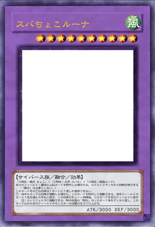 | 「2期生-癒月 ちょこ」+「2期生-大空 スバル」+「4期生-姫森ルーナ」 自分のフィールド・墓地の上記カードを除外した場合のみ、エクストラデッキから特殊召喚できる。(「融合」は必要としない。) このカード名の①の効果は1ターンに1度しか使用できない。 ①:相手のカードの効果が発動した場合に、このカードを除外して発動できる。相手フィールドのカード1枚を選んで手札に戻す。この効果のチェーン処理後、このカードを自分フィールドに戻す。 ②:エンドフェイズに発動できる。除外状態の「期生」モンスター1体をデッキに戻し、このカード以外の自分フィールドのモンスターの攻撃力を300上げる。 | |||