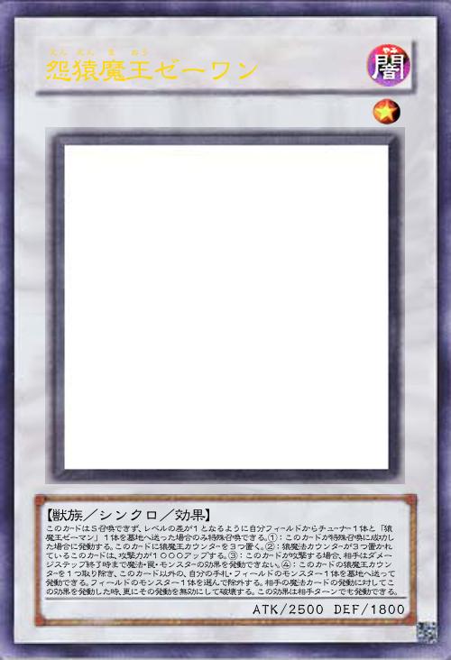 | このカードはS召喚できず、レベルの差が1となるように自分フィールドからチューナー1体と「猿魔王ゼーマン」1体を墓地へ送った場合のみ特殊召喚できる。①:このカードが特殊召喚に成功した場合に発動する。このカードに猿魔王カウンターを3つ置く。②:猿魔法カウンターが3つ置かれているこのカードは、攻撃力が1000アップする。③:このカードが攻撃する場合、相手はダメージステップ終了時まで魔法・罠・モンスターの効果を発動できない。④:このカードの猿魔王カウンターを1つ取り除き、このカード以外の、自分の手札・フィールドのモンスター1体を墓地へ送って発動できる。フィールドのモンスター1体を選んで除外する。相手の魔法カードの発動に対してこの効果を発動した時、更にその発動を無効にして破壊する。この効果は相手ターンでも発動できる。 | |||