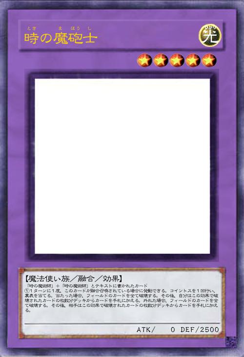 | 「時の魔術師」+「時の魔術師」とテキストに書かれたカード ①1ターンに1度、このカードが融合召喚されている場合に発動できる。コイントスを1回行い、裏表を当てる。当たった場合、フィールドのカードを全て破壊する。その後、自分はこの効果で破壊されたカードの枚数分デッキからカードを手札に加える。外れた場合、フィールドのカードを全て破壊する。その後、相手はこの効果で破壊されたカードの枚数分デッキからカードを手札に加える。 | |||