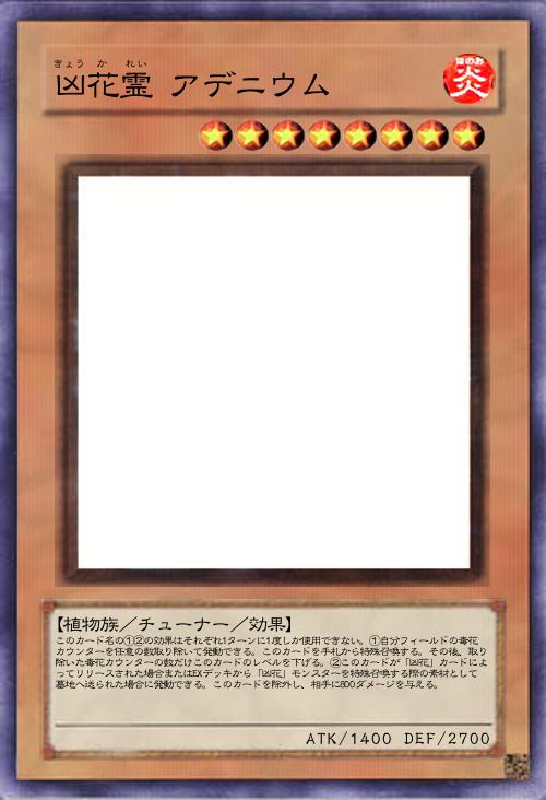 | このカード名の①②の効果はそれぞれ1ターンに1度しか使用できない。①自分フィールドの毒花カウンターを任意の数取り除いて発動できる。このカードを手札から特殊召喚する。その後、取り除いた毒花カウンターの数だけこのカードのレベルを下げる。②このカードが「凶花」カードによってリリースされた場合またはEXデッキから「凶花」モンスターを特殊召喚する際の素材として墓地へ送られた場合に発動できる。このカードを除外し、相手に800ダメージを与える。 | |||