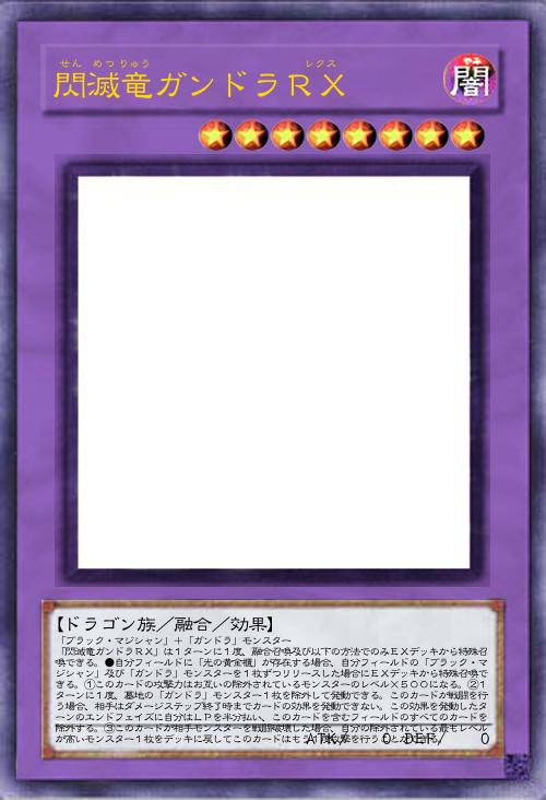 | 「ブラック・マジシャン」+「ガンドラ」モンスター 「閃滅竜ガンドラRX」は1ターンに1度、融合召喚及び以下の方法でのみEXデッキから特殊召喚できる。●自分フィールドに「光の黄金櫃」が存在する場合、自分フィールドの「ブラック・マジシャン」及び「ガンドラ」モンスターを1枚ずつリリースした場合にEXデッキから特殊召喚できる。①このカードの攻撃力はお互いの除外されているモンスターのレベル×500になる。②1ターンに1度、墓地の「ガンドラ」モンスター1枚を除外して発動できる。このカードが戦闘を行う場合、相手はダメージステップ終了時までカードの効果を発動できない。この効果を発動したターンのエンドフェイズに自分はLPを半分払い、このカードを含むフィールドのすべてのカードを除外する。③このカードが相手モンスターを戦闘破壊した場合、自分の除外されている最もレベルが高いモンスター1枚をデッキに戻してこのカードはもう1度攻撃を行うことができる。 | |||