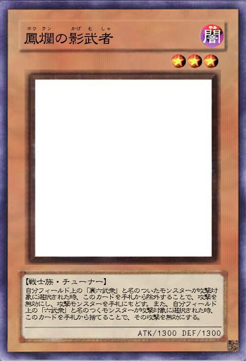 | 自分フィールド上の「裏六武衆」と名のついたモンスターが攻撃対象に選択された時、このカードを手札から除外することで、攻撃を無効にし、攻撃モンスターを手札にもどす。また、自分フィールド上の「六武衆」と名のつくモンスターが攻撃対象に選択された時、このカードを手札から捨てることで、その攻撃を無効にする。 | |||