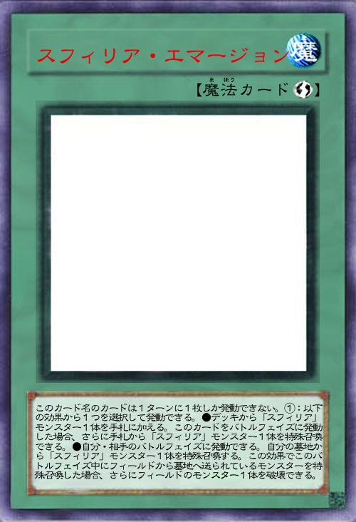 | このカード名のカードは1ターンに1枚しか発動できない。①:以下の効果から1つを選択して発動できる。●デッキから「スフィリア」モンスター1体を手札に加える。このカードをバトルフェイズに発動した場合、さらに手札から「スフィリア」モンスター1体を特殊召喚できる。●自分・相手のバトルフェイズに発動できる。自分の墓地から「スフィリア」モンスター1体を特殊召喚する。この効果でこのバトルフェイズ中にフィールドから墓地へ送られているモンスターを特殊召喚した場合、さらにフィールドのモンスター1体を破壊できる。 | |||