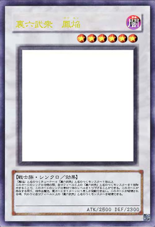 「鳳焔」と名のつくチューナー+「裏六武衆」と名のつくモンスター1体以上 このカードのシンクロ召喚の際、自分フィールド上の「裏六武衆」と名のつくモンスターを1体除外することで、このカードのシンクロ素材1体のレベルを1つ下げることができる。このカードが存在する限り、相手は魔法、罠カードを1ターンに1度しか発動できない。このカードが破壊される時、代わりに自分フィールド上の「裏六武衆」と名のつくモンスターを破壊できる。 |
