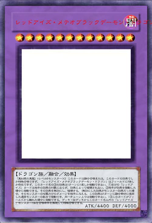 | 「真紅眼の黒龍」+レベル6モンスター×2 このカードは融合召喚または、このカードの効果でしか特殊召喚できず、「レッドアイズ・メテオブラックデーモン・ドラゴン」はフィールドに1体しか存在できず、このカード名の③の効果は1ターンに1度しか発動できない。①自分の「レッドアイズ」カードは相手の効果の対象にならず、効果によって破壊されない。②相手が効果を発動した場合に発動できる。その効果を無効にし、破壊する。(無効にした効果がモンスター効果だった場合、そのモンスターの攻撃力分のダメージを相手に与える。この効果は1ターンに融合素材に使用した通常モンスターの数まで発動でき、同一チェーン上では発動できない。)③このカードがフィールドから離れた場合に発動できる。デッキ・EXデッキからこのカード名以外の「レッドアイズ」モンスター1体を召喚条件を無視して特殊召喚できる。 | |||