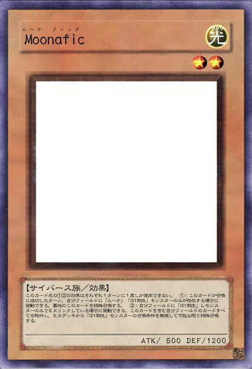 | このカード名の①②の効果はそれぞれ1ターンに1度しか使用できない。 ①:このカードが召喚に成功したターン、自分フィールドに「ムーナ」「ID1期生」モンスターのみが存在する場合に発動できる。墓地のこのカードを特殊召喚する。 ②:自分フィールドに「ID1期生」LモンスターのみでEXリンクしている場合に発動できる。このカードを含む自分フィールドのカードすべてを除外し、EXデッキから「ID1期生」モンスターの召喚条件を無視して可能な限り特殊召喚する。 | |||