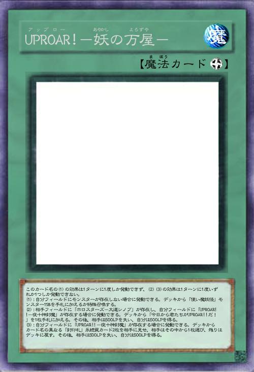 | このカード名の(1)の効果は1ターンに1度しか発動できず、(2)(3)の効果は1ターンに1度いずれか1つしか発動できない。 (1):自分フィールドにモンスターが存在しない場合に発動できる。デッキから「使い魔妖怪」モンスター1体を手札に加えるか特殊召喚する。 (2):相手フィールドに「ホロスターズ-大道シノブ」が存在し、自分フィールドに「UPROAR!!-夜十神封魔」が存在する場合に発動できる。デッキから「今日から君たちがUPROAR!!だ!」を1枚手札に加える。その後、相手は500LPを失い、自分は500LPを得る。 (3):自分フィールドに「UPROAR!!-夜十神封魔」が存在する場合に発動できる。デッキからカード名の異なる「封印札」永続罠カード2枚を相手に見せ、相手はその中から1枚選び、残りはデッキに戻す。その後、相手は500LPを失い、自分は500LPを得る。 | |||