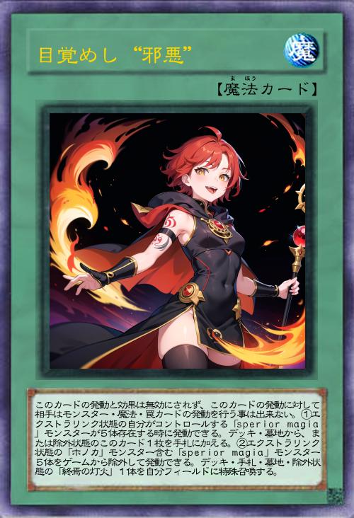 | このカードの発動と効果は無効にされず、このカードの発動に対して相手はモンスター・魔法・罠カードの発動を行う事は出来ない。①エクストラリンク状態の自分がコントロールする「sperior magia」モンスターが5体存在する時に発動できる。デッキ・墓地から、または除外状態のこのカード1枚を手札に加える。②エクストラリンク状態の「ホノカ」モンスター含む「sperior magia」モンスター5体をゲームから除外して発動できる。デッキ・手札・墓地・除外状態の「終焉の灯火」1体を自分フィールドに特殊召喚する。 | |||