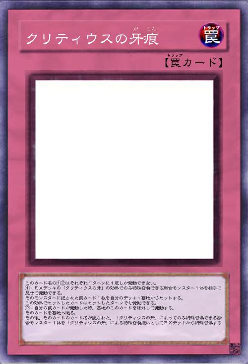 | このカード名の①②はそれぞれ1ターンに1度しか発動できない。 ①:EXデッキの「クリティウスの牙」の効果でのみ特殊召喚できる融合モンスター1体を相手に見せて発動できる。 そのモンスターに記された罠カード1枚を自分のデッキ・墓地からセットする。 この効果でセットしたカードはセットしたターンでも発動できる。 ②:自分の罠カードが発動した時、墓地のこのカードを除外して発動する。 そのカードを墓地へ送る。 その後、そのカードのカード名が記された、「クリティウスの牙」によってのみ特殊召喚できる融合モンスター1体を「クリティウスの牙」による特殊召喚扱いとしてEXデッキから特殊召喚する | |||