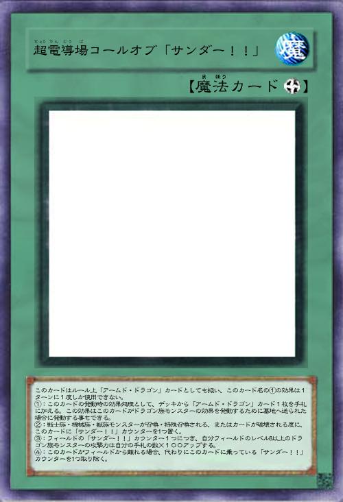 | このカードはルール上「アームド・ドラゴン」カードとしても扱い、このカード名の①の効果は1ターンに1度しか使用できない。 ①:このカードの発動時の効果処理として、デッキから「アームド・ドラゴン」カード1枚を手札に加える。この効果はこのカードがドラゴン族モンスターの効果を発動するために墓地へ送られた場合に発動する事もできる。 ②:戦士族・機械族・獣族モンスターが召喚・特殊召喚される、またはカードが破壊される度に、このカードに「サンダー!!」カウンターを1つ置く。 ③:フィールドの「サンダー!!」カウンター1つにつき、自分フィールドのレベル8以上のドラゴン族モンスターの攻撃力は自分の手札の数×100アップする。 ④:このカードがフィールドから離れる場合、代わりにこのカードに乗っている「サンダー!!」カウンターを1つ取り除く。 | |||
