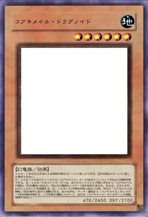 | このカード名の①の方法による特殊召喚は1ターンに1度しかできず、③の効果は1ターンに1度しか使用できない。 ①:このカードは自分フィールドの「コアキメイル」カード1枚をリリースして手札から特殊召喚できる。②:このカードのコントローラーは、自分のエンドフェイズ毎に手札から「コアキメイルの鋼核」1枚を墓地へ送るか、手札の幻竜族モンスター1体を相手に見せる。または、どちらも行わずにこのカードを破壊する。③:このカードが特殊召喚に成功した時、手札の「コアキメイルの鋼核」1枚を相手に見せて発動できる。自分の手札・デッキ・墓地から「コアキメイル」モンスター1体を特殊召喚する。この効果を発動したターン、自分は「コアキメイル」モンスターしか特殊召喚できない。 | |||