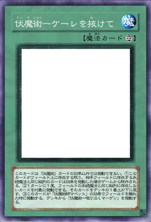 | このカードは「伏魔術」カードの効果以外では発動できない。①このカードがフィールド上に存在する限り、相手フィールドに存在する永続魔法と同じ縦列のカードは効果を発動した場合ゲームから除外される。②1ターンに1度、フィールドの永続魔法と同じ縦列に存在しないカードを対象に発動できる。そのカードをデッキの1番上か下に戻す。③このカードが「伏魔術師マペット」の効果でフィールドを離れた時に発動する。デッキから「伏魔術ー啜り泣くマーゲン」を発動する。 | |||