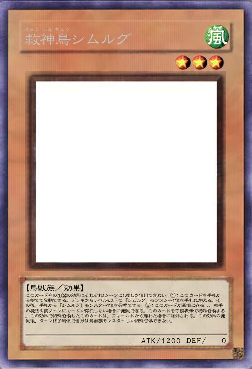 | このカード名の①②の効果はそれぞれ1ターンに1度しか使用できない。①:このカードを手札から捨てて発動できる。デッキからレベル4以下の「シムルグ」モンスター1体を手札に加える。その後、手札から「シムルグ」モンスター1体を召喚できる。②:このカードが墓地に存在し、相手の魔法&罠ゾーンにカードが存在しない場合に発動できる。このカードを守備表示で特殊召喚する。この効果で特殊召喚したこのカードは、フィールドから離れた場合に除外される。この効果の発動後、ターン終了時まで自分は鳥獣族モンスターしか特殊召喚できない。 | |||