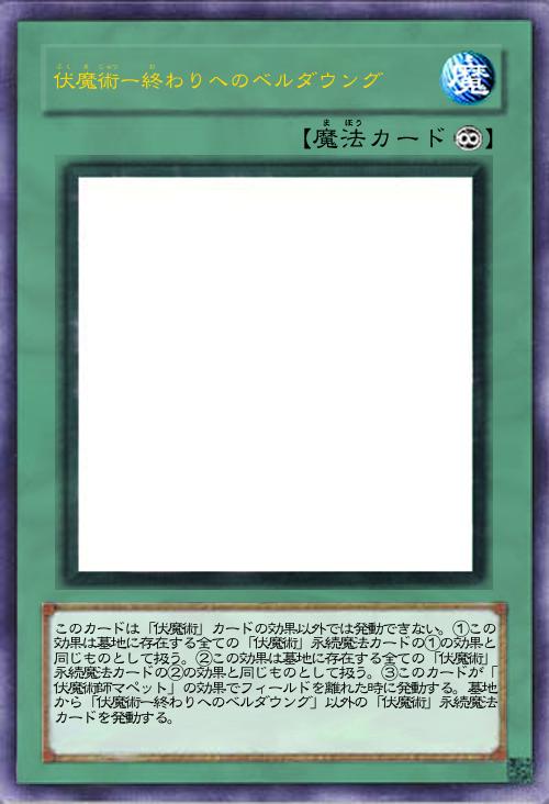 | このカードは「伏魔術」カードの効果以外では発動できない。①この効果は墓地に存在する全ての「伏魔術」永続魔法カードの①の効果と同じものとして扱う。②この効果は墓地に存在する全ての「伏魔術」永続魔法カードの②の効果と同じものとして扱う。③このカードが「伏魔術師マペット」の効果でフィールドを離れた時に発動する。墓地から「伏魔術ー終わりへのベルダウング」以外の「伏魔術」永続魔法カードを発動する。 | |||
