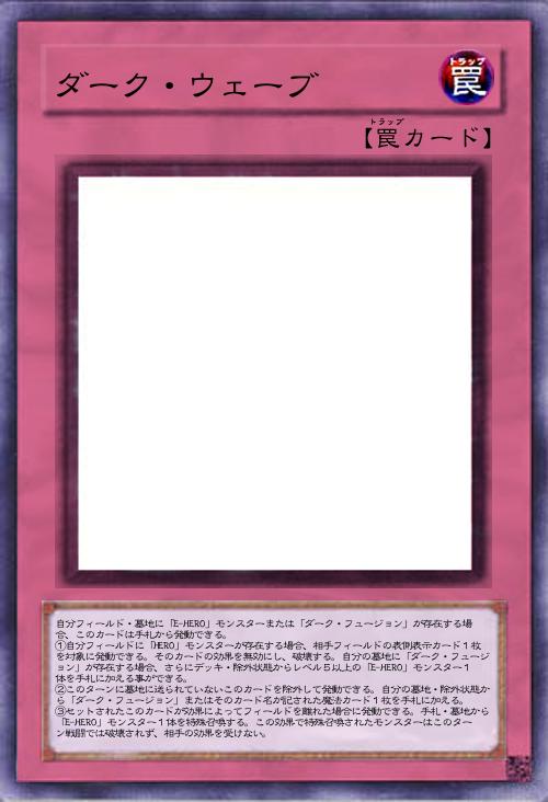 | 自分フィールド・墓地に「E-HERO」モンスターまたは「ダーク・フュージョン」が存在する場合、このカードは手札から発動できる。 ①自分フィールドに「HERO」モンスターが存在する場合、相手フィールドの表側表示カード1枚を対象に発動できる。そのカードの効果を無効にし、破壊する。自分の墓地に「ダーク・フュージョン」が存在する場合、さらにデッキ・除外状態からレベル5以上の「E-HERO」モンスター1体を手札に加える事ができる。 ②このターンに墓地に送られていないこのカードを除外して発動できる。自分の墓地・除外状態から「ダーク・フュージョン」またはそのカード名が記された魔法カード1枚を手札に加える。 ③セットされたこのカードが効果によってフィールドを離れた場合に発動できる。手札・墓地から「E-HERO」モンスター1体を特殊召喚する。この効果で特殊召喚されたモンスターはこのターン戦闘では破壊されず、相手の効果を受けない。 | |||
