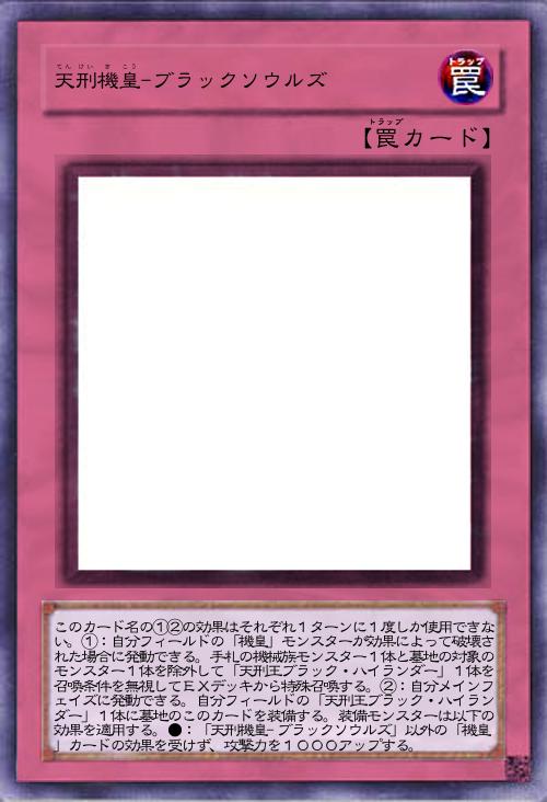 | このカード名の①②の効果はそれぞれ1ターンに1度しか使用できない。①:自分フィールドの「機皇」モンスターが効果によって破壊された場合に発動できる。手札の機械族モンスター1体と墓地の対象のモンスター1体を除外して「天刑王ブラック・ハイランダー」1体を召喚条件を無視してEXデッキから特殊召喚する。②:自分メインフェイズに発動できる。自分フィールドの「天刑王ブラック・ハイランダー」1体に墓地のこのカードを装備する。装備モンスターは以下の効果を適用する。●:「天刑機皇-ブラックソウルズ」以外の「機皇」カードの効果を受けず、攻撃力を1000アップする。 | |||