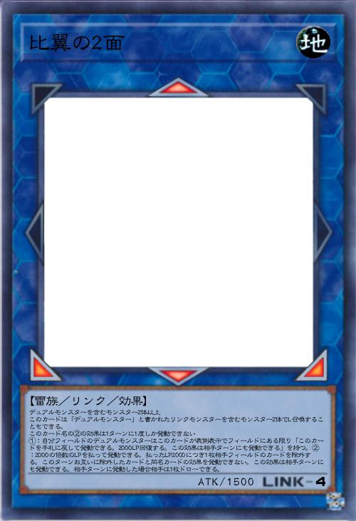 | デュアルモンスターを含むモンスター2体以上 このカードは「デュアルモンスター」と書かれたリンクモンスターを含むモンスター2体でL召喚することもできる。 このカード名の②の効果は1ターンに1度しか発動できない ①:自分フィールドのデュアルモンスターはこのカードが表側表示でフィールドにある限り「このカードを手札に戻して発動できる。2000LP回復する。この効果は相手ターンにも発動できる」を持つ。②:2000の倍数のLPを払って発動できる。払ったLP2000につき1枚相手フィールドのカードを除外する。このターンお互いに除外したカードと同名カードの効果を発動できない。この効果は相手ターンにも発動できる。相手ターンに発動した場合相手は1枚ドローできる。 | |||