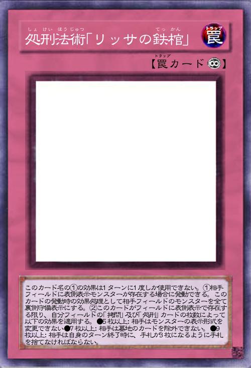 | このカード名の①の効果は1ターンに1度しか使用できない。①相手フィールドに表側表示モンスターが存在する場合に発動できる。このカードの発動時の効果処理として相手フィールドのモンスターを全て裏側守備表示にする。②このカードがフィールドに表側表示で存在する限り、自分フィールドの「拷問」及び「処刑」カードの枚数によって以下の効果を適用する。●5枚以上:相手はモンスターの表示形式を変更できない●7枚以上:相手は墓地のカードを除外できない。●9枚以上:相手は自身のターン終了時に、手札が3枚になるように手札を捨てなければならない。 | |||